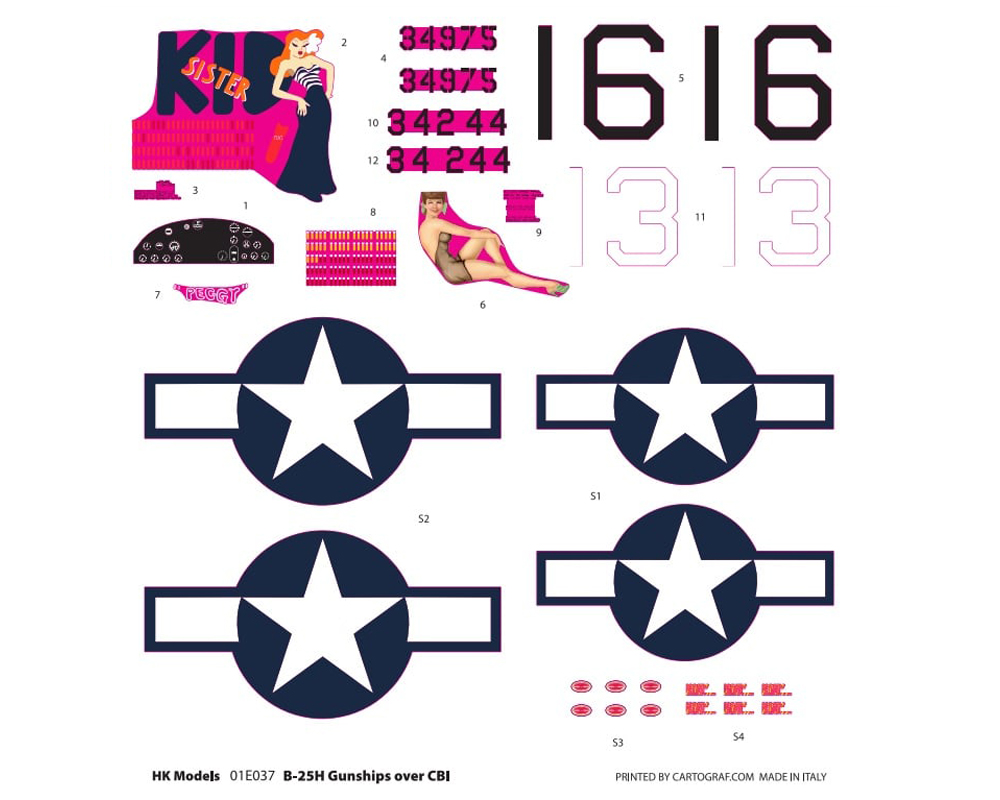 Markings for 2 USAF aircraft. (1) s/n 43-4975, 81st BS/12th BG, India, Spring 1943, (2) s/n 43-4244, 81st BS/12th BG, India, Spring 1945. L: 498mm, W: 643mm, 563 parts.