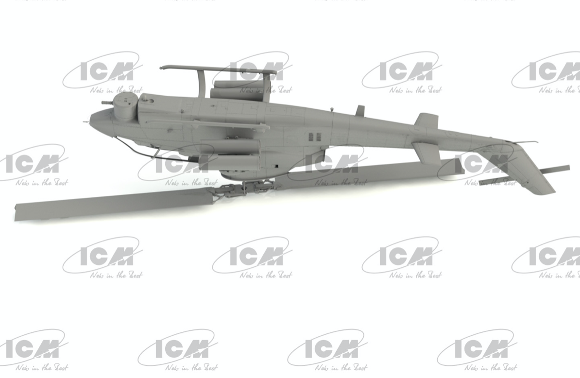 ICM - 1/32 Bell AH-1G Cobra (early production), US Attack Helicopter (100 new molds) Check out ICM3001 paint set for this kit. (Expect to see an Xtradecal for this kit!) In March 1965, Bell began development of a close air support combat helicopter based on the Model 204 (UH-1B/-1C Iroquois). Eventually designated the AH-1G and named the Huey Cobra, it began supplying to the U.S. Army in June 1967 and was used in combat operations in Vietnam in September. 1,127 AH-1Gs were delivered to the U.S. Army, including the TH-1G dual-control training helicopters. The serial AH-1G helicopter, which became the base for further modifications, had a single-rotor design with a tail rotor, one Gte and a ski landing gear. The fuselage was all-metal, half-monocoque type. Cockpit is two-seat, with the shooter and pilot seats located one behind the other.
