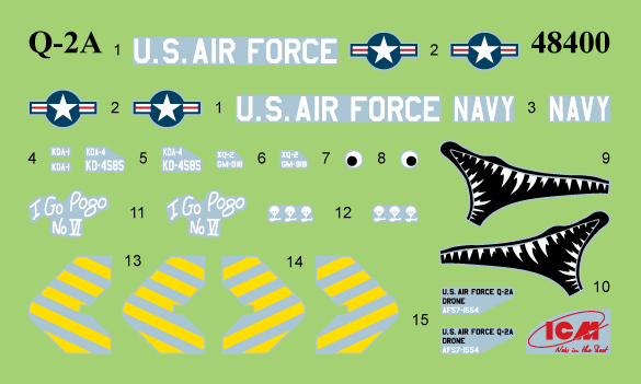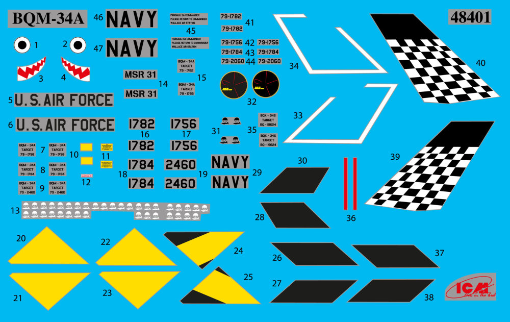 ICM - 1/48 US Aerial Target Drones 2 drones and 2 trailers. In 1948 the USAF for United States Air Force signed a contract with the Ryan company to develop a jet- powered unmanned aircraft intended as a target for training purposes. The prototype drone, named XQ-2, made its first flight in 1951. Following successful testing, it entered service with the USAF as the Q-2A for also known as the Firebee. A slightly modified version, designated KDA-1, was operated by the military fleet. In the late 1950s, a new contract was awarded between the USAF and Ryan for a significantly improved 'second-generation' Firebee the Model 124, initially designated as the Q-2C. It went into production in 1960, and three years later, its designation was changed to BQM-34A. This drone featured an enlarged fuselage, longer wings, and a unique intake port under the pointed nose. The US Navy also adopted the BQM-34A, while the Army received a ground-launched version called the MQM-34D with a Jato for Jet-Assisted Take-Off booster. These drones were used for training anti-