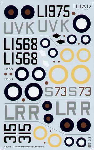 Iliad Design - 1/48 Hawker Hurricane Mk.I (4) Pre-war aircraft. L1568/S 73 Sqn 1938, L1975 UV-K 17Sqn 1939, 315 1 Sqn Rcaf 1939 all with fabric covered wings/2 blade Watts props. L1990 LR-R 56Sqn 1939. All Dk Earth/Dk Green/Aluminium. 17 and 56Sqn have black port wing undersurface