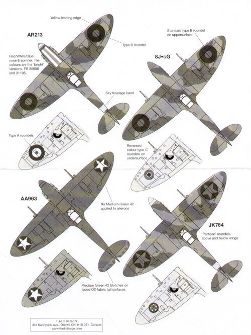 Iliad Design - 1/48 Oddball Supermarine Spitfire (4) Mk.I AR213 JZ-E 57 Out 1942 with red,white and blue stripes on nose, Mk.IXe 8J-GG Gc 11/7 French, Mk.Vc JK784/L 352 Yugoslav Sqn, AA963 used for evaluation in US 1942