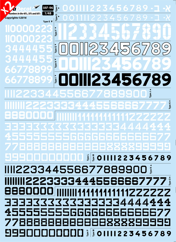 IsraDecal Studio - 1/48 Numbers for Israeli Air Force aircraft from the 1940s, 50s and 60s. Multiple sheets includes many numbers for many models. 8 pages instruction booklet.