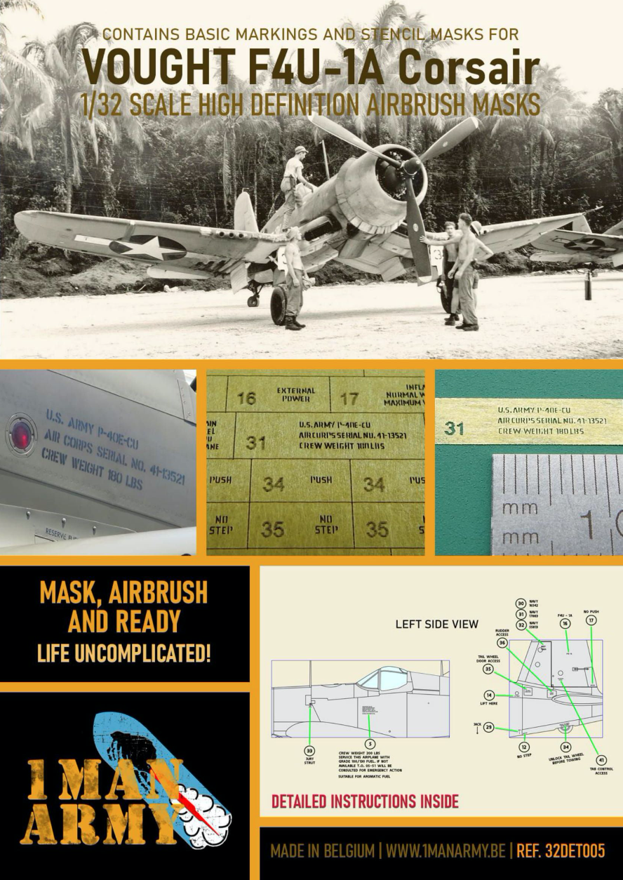 1ManArmy - 1/32 Vought F4U-1A/F4U-1c/F4U-1 Corsair high definition stencilling and national insignia paint masks (for Hasegawa, Revell, Tamiya and Trumpeter kits)