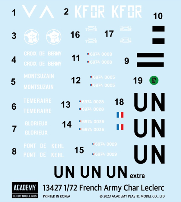 Reboxed Ace Corporation kit. 4 sprues. 120mm CN120-26/52 main gun & 7.62mm AAT-52 NF1 machine gun. Choice of 5 markings: