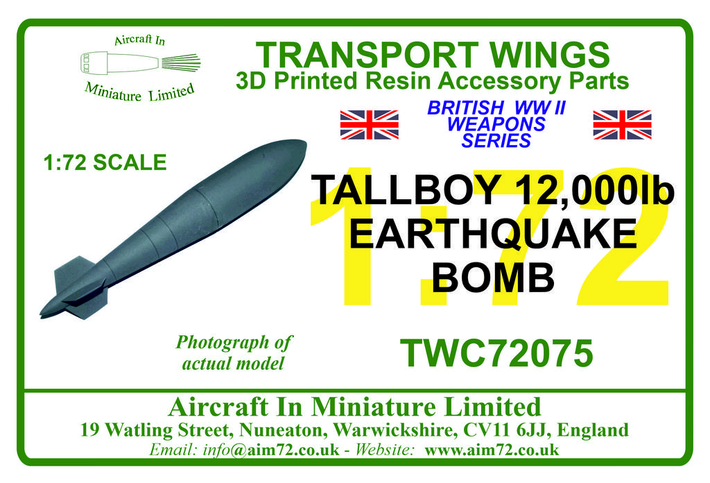 AIM - 1/72 Tallboy bomb. One of the largest conventional bombs used in World War II, this 12,000lb bomb was designed by Dr. Barnes Wallis to penetrate deep into the earth before exploding, thus causing an earthquake. (Designed for use with the Airfix or Revell kits of the Avro Lancaster B.I/III ).