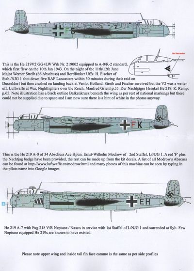 Aims - 1/32 Heinkel He-219A 7 G9+DH Staffel I/NJG 1 Paderborn 1945; G9+BA Stab/NJG 1; D5+BL 3rd Staffel 1/NJG 3 black undersurfaces; G9+DB replacement Wk Nr for Revell ; G9+FB ; G9+FK 2nd Staffel I/NJG 1; G9+EH 1stStaffel 1/NJG 1 fitted with Neptune. for Revell