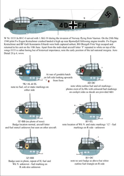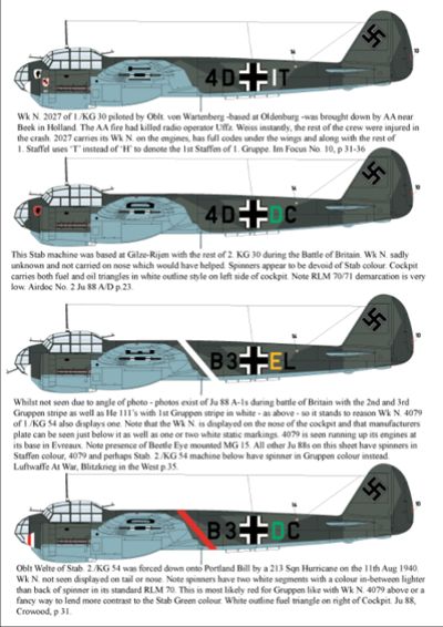 Aims - 1/48 Junkers Ju 88 early versions 9K+AL The subject - together to a lesser extent 9K+EL - of much photography 9K+AL Wk N. 3153 of 1./KG 51 prepares for a mission during the Battle of Britain from its base at Melun. 3153 is in standard RLM 70/71/65 but has the EZ-6 direction finder cover painted in a lighter colour like RLM 02 - 9K+EL has this same feature. Note also the spinners are in the Staffen colour of yellow whilst the white of 1 Gruppe adorns the radiator rim of the engines, obviously the Staffelkapitan had to have a more colourful aircraft for the propaganda day. 3153 carries full codes repeated under wings, note early position of tail insignia and no fuel triangles on side of cockpit. 9K+EL Details for Wk.N 3134 same as above although no Gruppe marking and beam MG 15 positions plated over. Left side view - Ju 88 vol 1, p 61, Classic, Right side view Luftwaffe At War Blitzkrieg in the West 39-42 p 33 3Z+BB Pilot Oblt. Siegward Fiebig was shot down in Wk N. 4136 becoming a POW with his crew after crash landing near Hertingfordbury after attacking the de Havilland factory at Hatfield where it was hit by AA. Only tail and upper left wing are seen in photos so style of codes, badge, presence of fuel triangle on cockpit as well as repetition of individual aircraft letter on nose and spinner tips in Stab colour - all as seen on other KG 77 machines of the time. Ju 88 vol 2, p 392, Classic. 3Z+HN Flown by Staffelkapitan Gunther Zetzsche Wk N. 7112 of 2./KG 77 was shot down by a Hurricane of 229 Sqn, coming down into the Channel 15 miles off Bexhill with all crew lost. An earlier photo of the machine shows no sign of the Wk N. on tail fin so might well be hidden from view on the nose of the cockpit. 7112 bears tactical markings on both sides of rudder and left wing only as per 3Z+BB as well as repetition of individual aircraft letter on upper wings - maybe nose also? Osprey No.17 Ju 88 Kampfgeschwader On the Western Front p. 4, 58 4D+IT Wk N. 2027 of 1./KG 30 piloted by Oblt. von Wartenberg -based at Oldenburg -was brought down by AA near Beek in Holland. The AA fire had killed radio operator Uffz. Weiss instantly, the rest of the crew were injured in the crash. 2027 carries its Wk N. on the engines, has full codes under the wings and along with the rest of 1. Staffel uses T instead of H to denote the 1st Staffen of 1. Gruppe. Im Focus No. 10, p 31-36 4D+DC This Stab machine was based at Gilze-Rijen with the rest of 2. KG 30 during the Battle of Britain. Wk N. sadly unknown and not carried on nose which would have helped. Spinners appear to be devoid of Stab colour. Cockpit carries both fuel and oil triangles in white outline style on left side of cockpit. Note RLM 70/71 demarcation is very low. Airdoc No. 2 Ju 88 A/D p.23. B3+EL Whilst not seen due to angle of photo - photos exist of Ju 88 A-1s during battle of Britain with the 2nd and 3rd Gruppen stripe as well as He 111s with 1st Gruppen stripe in white - as above - so it stands to reason Wk N. 4079 of 1./KG 54 also displays one. Note that the Wk N. is displayed on the nose of the cockpit and that manufacturers plate can be seen just below it as well as one or two white static markings. 4079 is seen running up its engines at its base in Evreaux. Note presence of Beetle Eye mounted MG 15. All other Ju 88s on this sheet have spinners in Staffen colour, 4079 and perhaps Stab. 2./KG 54 machine below have spinner in Gruppen colour instead. Luftwaffe At War, Blitzkrieg in the West p.35. B3+DC Oblt Welte of Stab. 2./KG 54 was forced down onto Portland Bill by a 213 Sqn Hurricane on the 11th Aug 1940. Wk N. not seen displayed on tail or nose. Note spinners have two white segments with a colour in-between lighter than back of spinner in its standard RLM 70. This is most likely red for Gruppen like with Wk N. 4079 above or a fancy way to lend more contrast to the Stab Green colour. White outline fuel triangle on right of Cockpit. Ju 88, Crowood, p 31. 4D+FH W Nr. 0133 Ju 88 C-0 served with 1./KG 30 during the invasion of Norway flying from Vaernes. On the 20th May 1940 pilot Fw Eugen Kretschmer crashed landed it high up near Bjrnefjell following engine trouble. Fw Eugen Kretschmer and BF Gefr Konstantin Erhardt were both captured unhurt, BS Obergefr Fritz Vogt escaped and returned to his unit on the 10th June. Apart from the individual aircraft letter F repeated in white on top of the wings 0133 is rather boring but of historical importance, note the early position of the tail national insignia. Aero Detail 20 p.4 [Ju 88A-1 Ju 88A-4]