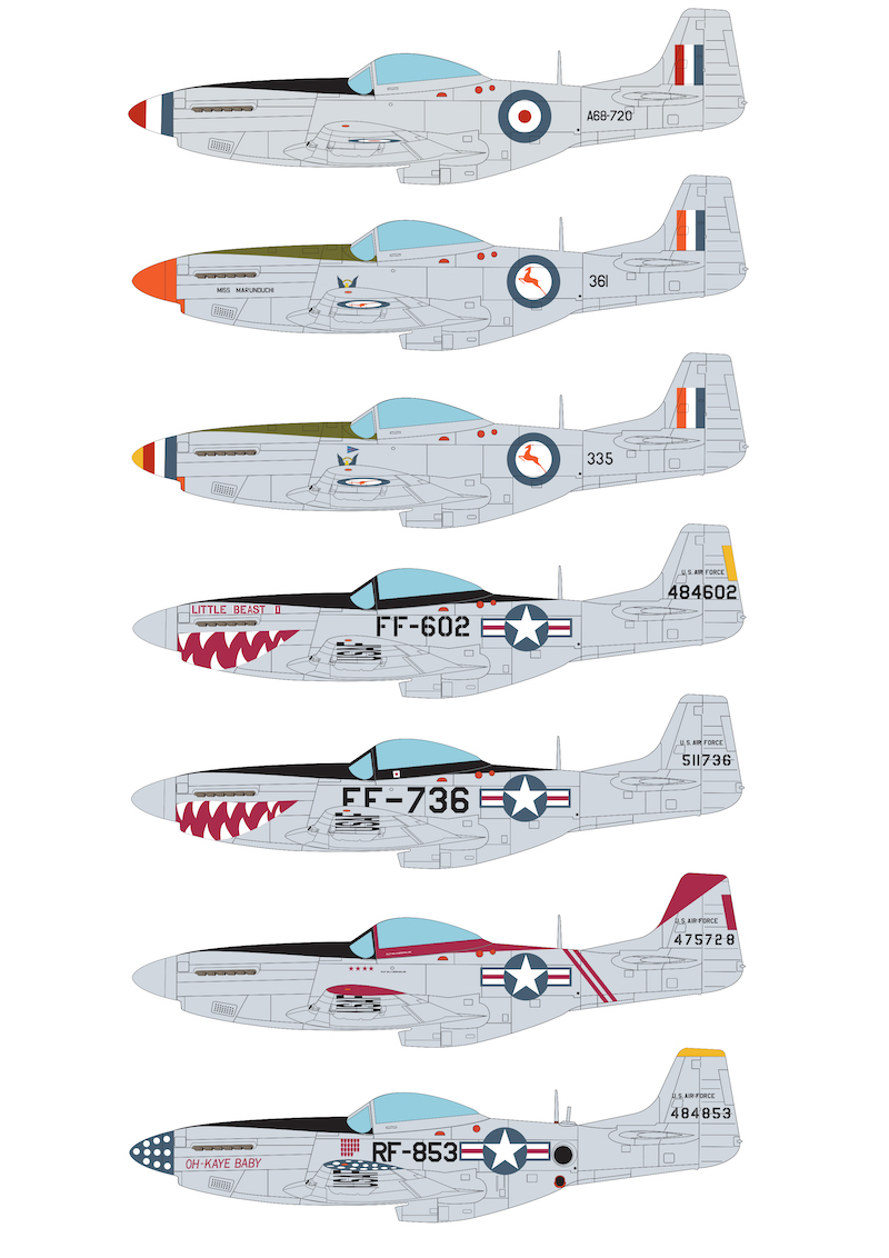 Aims - 1/48 Korean War North-American P-51D Mustangs. Includes Rsaaf x 2 inc 'Miss Marunochi', Usaaf x 4 inc OH-KAYE BABY' and 'LITTLE Beast II'