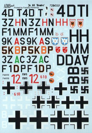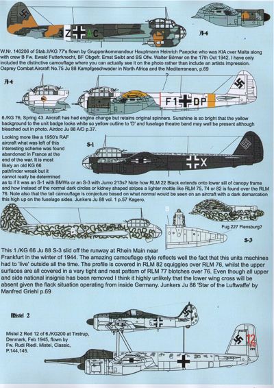 Includes;Ju-88-1 3Z+HN of 5./KG 77 Battle of BritainJu-88-1 4D+IT of 1./KG 30 Battle of FranceJu-88-5 F1+MM of 4./KG 76 Early Soviet CampaignJu-88-4 9K+AS of 8./KG 51 Crimea 1942Ju-88-4 5K+BP of 6./KG 3 Crimea 1942Ju-88-4 3Z+AC Stab II./KG 77 Sicily 1942Ju-88-4 F1+DP of 6./KG 76 Russia 1943Junkers Ju-88 S-1 Kg 66 France 1944Junkers Ju-88 S-3 of 1./KG 66 Germany 1944Mistel 2 of 6./KG 200 Denmark 1945
