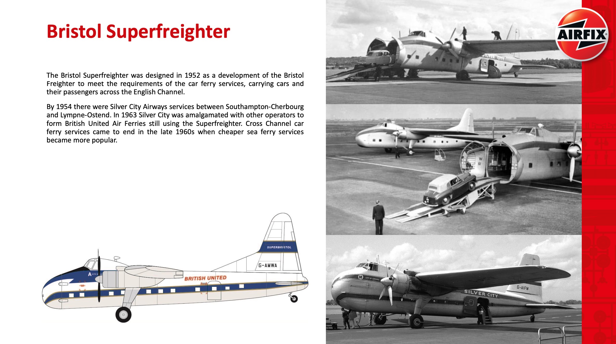 The Bristol Superfreighter was designed in 1952 as a development of the Bristol Freighter to meet the requirements of the car ferry services, carrying cars and their passengers across the English Channel.