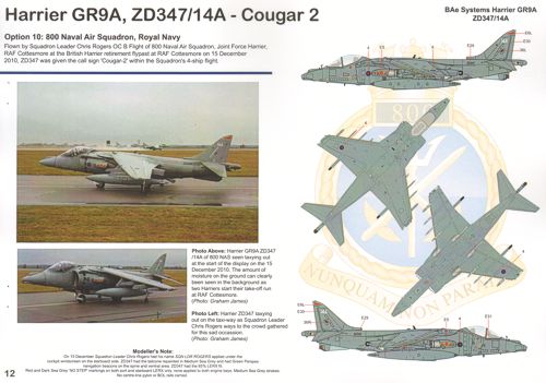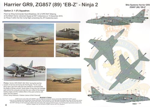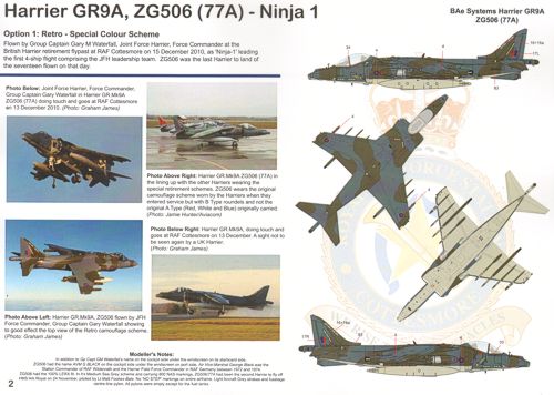 Airframe - 1/32 See ML32218 Harrier Retirement schemes.UK Air Arm Update Harrier Retirement (17) All the Harriers that took part in the final flypast on 15 December 2010. GR.9 ZG506 77A Gp Capt Gary M.Waterfall Joint Force Harrier Commander; ZG857 EB-Z W/C David Bradshaw Oc Ops Raf Wittering; ZD379/27; ZG862/94; ZG502/73; ZG858/90 4A? Sqn special tail markings; GR.9A ZD467/57A; ZG477/67A with 1(F) Sqn red/white tail markings; ZD433/45A; ZG472/62A; ZD351/18A 800 Nas red fin; ZD347/14A; T12A ZH665/113; ZH659/107; ZH664/112; ZH657/105. Inc instruction booklet and national insignia and stencil data for all Harriers.