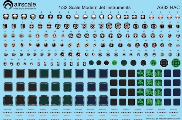 Airscale - 1/32 MODERN JETS Cockpit Instrument Decals Each set includes: Full colour cockpit instrumentation and Multi-Function-Displays representing key flight instruments found in modern jet fighter cockpits including F-14, F-15, F-16, F-18, Rafale, Tornado & Typhoon Multiple display screens in different colours, including 'live' screens with display info Each instrument is separate on the decal sheet with a minimum of carrier film Includes a small sheet of optically clear replacement simulated instrument glass Fully illustrated instructions