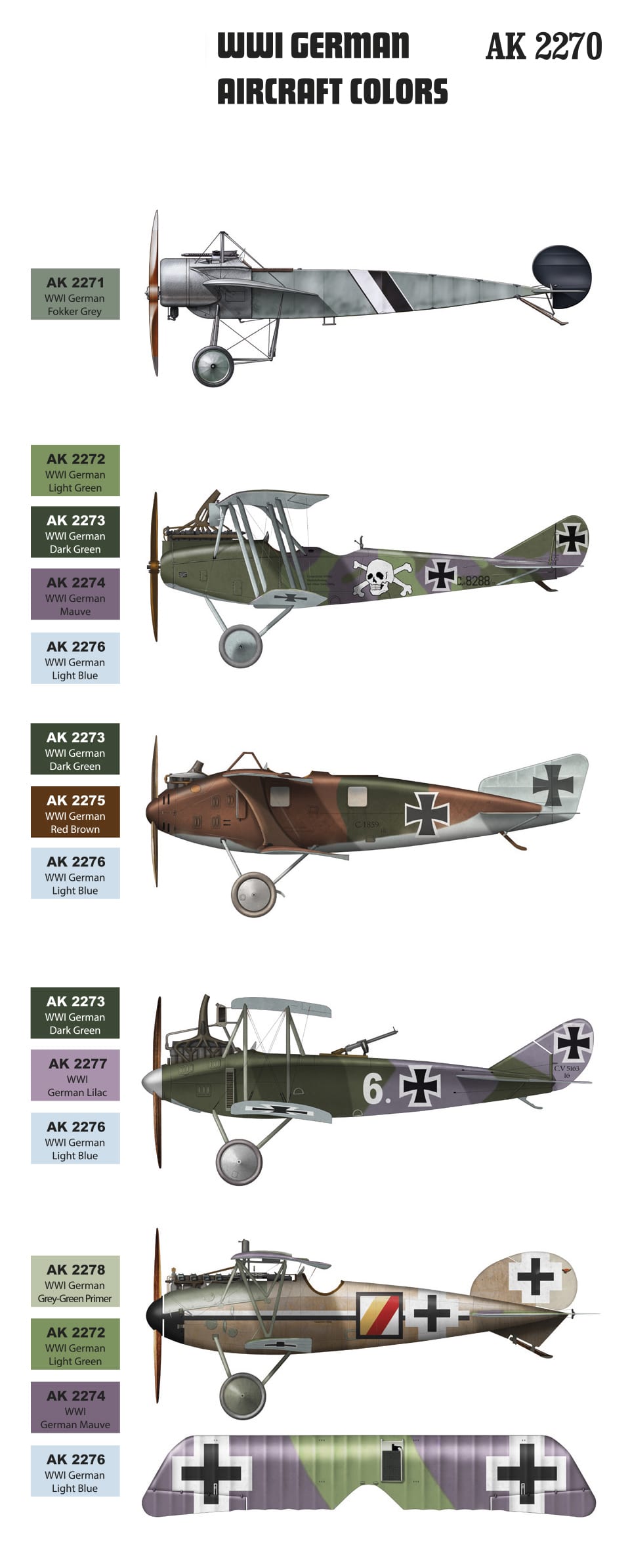 AK Interactive - This set offers the modeller, the seven colors that are essential for replicating the camouflage patterns that were most commonly seen on German aircraft, operated during World War One. Also included is the Grey- Green Primer color that was typically used for painting all metal panels and fittings. A profile guide is printed on the backside of the box. Our paints are not only historically accurate and specially formulated with top quality components; they also have been designed taking into account the scale reduction effect.*Our acrylic paints are ready to use straight from the bottle; simply shake, and the paint is ready to go. Dilution is not necessary when airbrushing Ak acrylic paints; however, when painting camouflage or fine lines, add a few drops of our specially formulated thinner AK712. Useful for all acrylic paints, the AK712 improves the performance of the paint and is vastly superior to most other available thinners, resulting in a greater degree of coverage when applied by brush.This set contains:AK2271 WWI German Fokker GreyAK2272 WWI German Light GreenAK2273 WWI German Dark GreenAK2274 WWI German MauveAK2275 WWI German Red BrownAK2276 WWI German Light BlueAK2277 WWI German LilacAK2278 WWI German Grey-Green Primer*A model aircraft reflects less light than an actual full size aircraft; this means the color applied to the model must be of a lighter shade to look the same as the full sized version. If the same color tones were applied to each, the model would appear darker as it reflects less light.