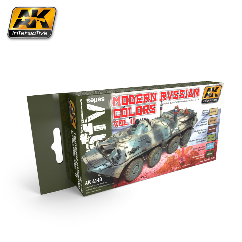 AK Interactive - MODERN RUSSIAN COLOURS VOL 2 This set is not only an add-on to the first set, with additional colours that you may use to reproduce even more camouflage patterns, but it also offers the three colours indispensible for recreating the attractive hard-edge camouflage scheme applied to many modern Russian vehicles recently. These acrylic paints are formulated for both brush and airbrush use, and they are soluble in water, meaning that you won't have odours as you would experience from the more aggressive, solvent-based paints. The acrylics are manufactured by AK-Interactive, and are made to the own formula, which prevents problems with them drying in the airbrush, causing potential blockages. This set contains: -AK-4141 Pale Tan -AK-4142 Orange Brown -AK-4143 Red Brown -AK-4144 Light Yellow Green -AK-4145 Blue Gray -AK-4146 Olive Green