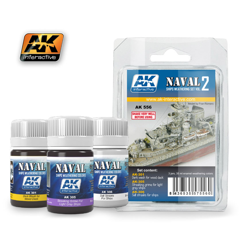 AK Interactive - Ships Weathering Set Vol.2 This set contains the products AK-301 Dark wash for wooden decks, AK-305 Streaking grime for light grey ships and AK-306 Salt Streaks for ships.