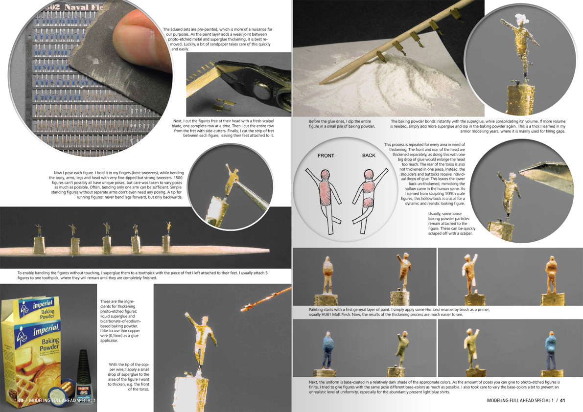 when we decided to launch the modelling full ahead project, we were aware that in an eighty page publication it was possible to condense the information needed to build a specific warship. But as modelling is evolving nowadays with it's curiosity, techniques, innovation, history, and certainly everything that pushes us to build a scale model, this cannot only be achieved with a monographic series. Baring this is mind and in response to the multitude of suggestions we received, we offer you a parallel to the monographs series. In this special issue we will deal with difficulties that may occur to you during the building stages, such as working with photo-etch, advanced painting, scratch-building, diorama composition, etc. With this guide we will not only help you to build ythe models but also have the possibility to tell its history.