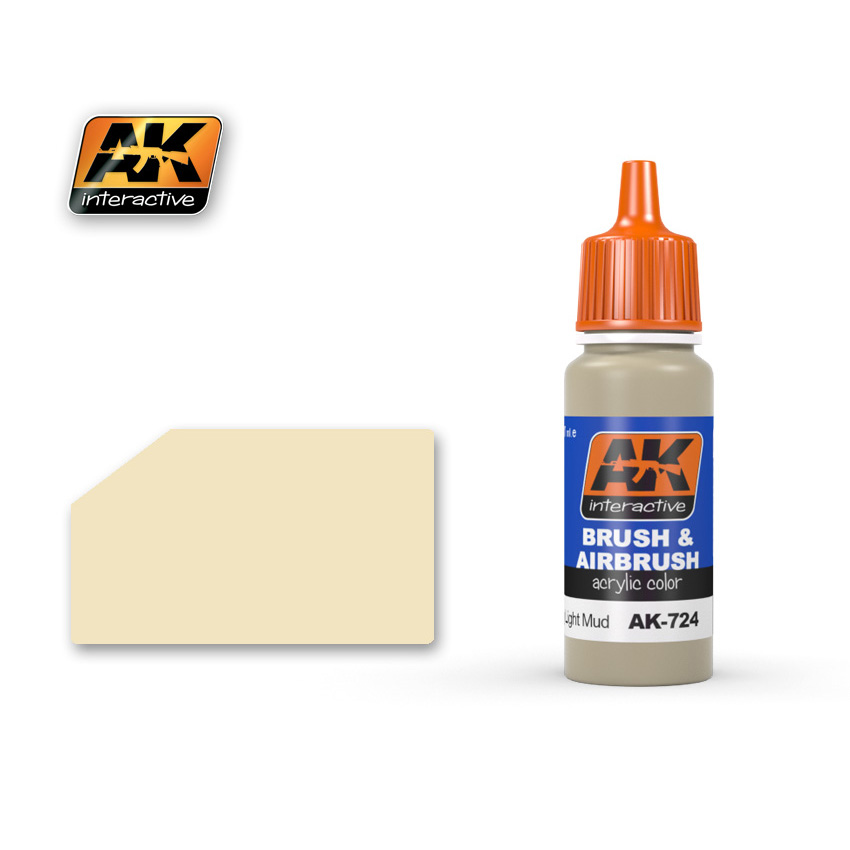 AK Interactive - Dry Light Mud Apply Dry Light Mud with Brush or Airbrush.Apply to rubber tires and tracks as a wash by diluting with water.Use with AK-723 Dust for a more realistic and diverse effect on lower hull and wheel well areas affected by travel.Use alone or mix with other acrylic paints to obtain a different color.Just shake it and use it directly in the airbrush or by brush.It can be easily thinned with the specific acrylic thinner or water if necessary.