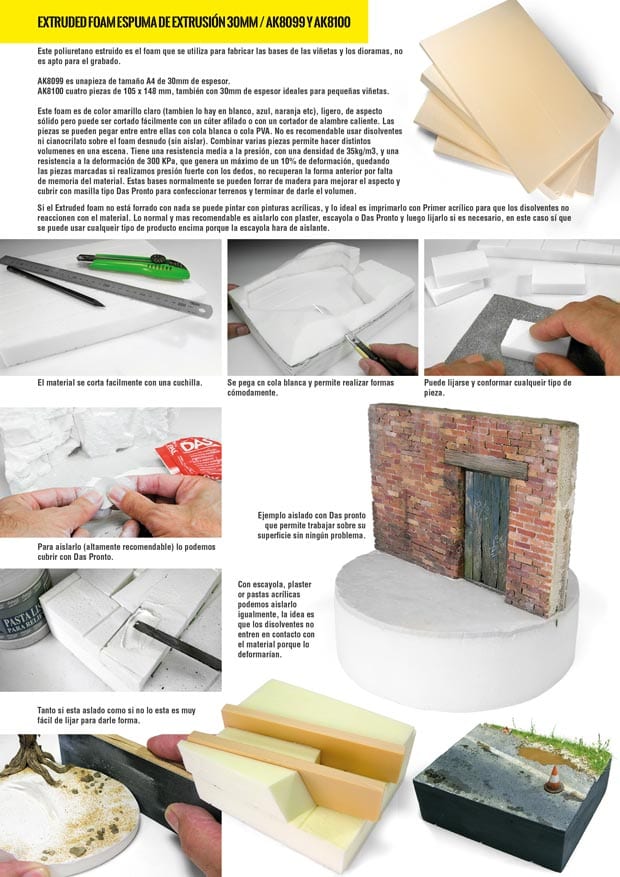 Extruded foam is the best material for the base of your diorama or vignette. Its surface and overall shape can be easily adapted to your requirements, although it is not really suitable for carving. Now you dont have to buy and store extra-large pieces, as we bring you this foam in reasonably- sized pieces that will suit most modelers needs.
