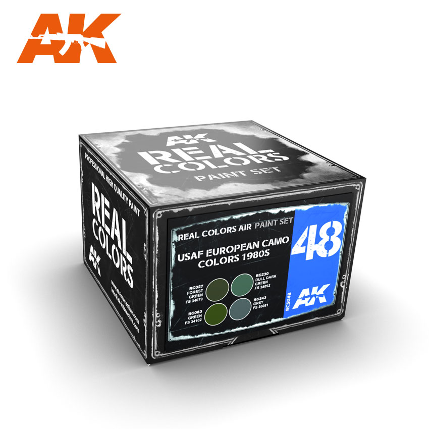AK Interactive - 1980s USAF European camouflage colors set for painting models of the US Aircraft finished in the so-called Euro i and euro II (lizard) camouflage schemes that had been used in the 1980s, including the A-10 Thunderbolt II, F-4 phantom II and some F-16 Falcons of the USAF, and A-7d corsair II of the Air National Guard