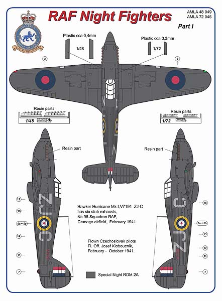 AML - 1/72 Hawker Hurricane Mk.I & Boulton-Paul Defiant Mk.I - 6 stub exhaust versions / Part I with decals for No.96 Squadron RAF, 1941. (for Airfix, Hasegawa and Revell kits)