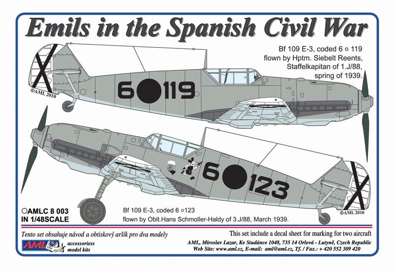 AML - 1/48 Messerschmitt Bf-109E in the Spanish Civil War. Includes decals for 2 aircraftAMLC 8 003 include:- 1xmasks x- 1xmask of canopy- 1x decals (pictures + numbers)