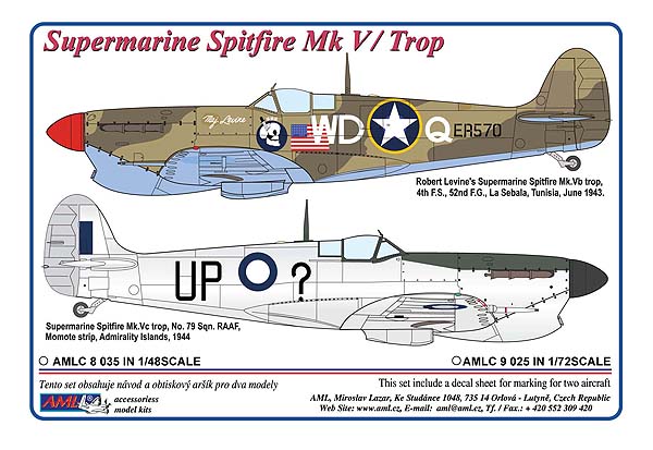 AML - 1/72 Supermarine Spitfire Mk.V / Trop 2 decal version: Spitfire MkVb trop, Robert Levine, 4th F.S., 52nd F.G., La Sebala, Tunisia, June 1943. Spitfire Mk.Vc trop, No.79 Sqn. RAAF, Momote strip, Admirality Islands, 1944.