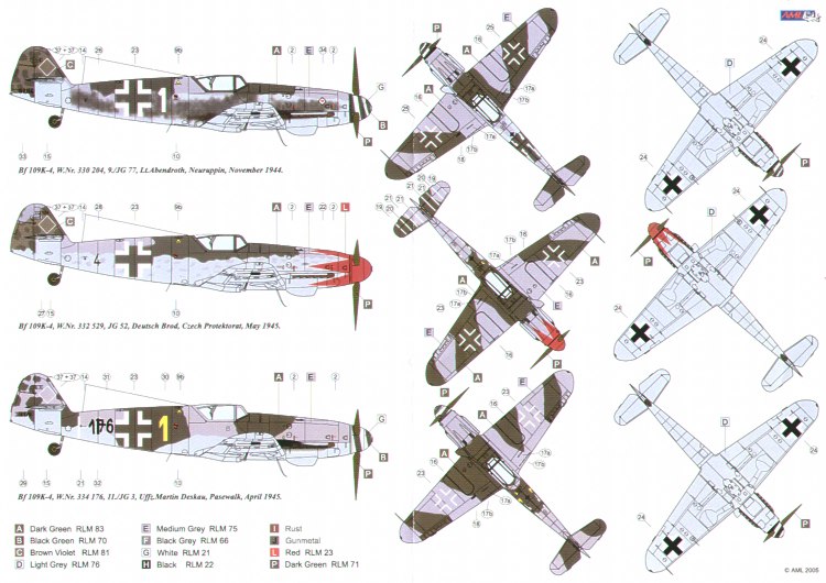 AML - 1/32 Messerschmitt Bf-109K-4 3 White 1 9/JG 77 Lt Abendroth 1944; Black 4 Jg 52 Red nose Tulip 1945; Yellow 1/176 11/JG3 Uffz Martin Deskau 1945. All in variations of Rlm 81/83/76. Includes resin wheels. 2 main and 1 tail
