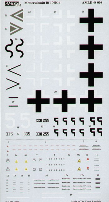AML - 1/48 Messerschmitt Bf-109K-4 3 Black ~ Stab III/JG52 Hptm A.Borchers; Black 1 + > Stab III/JG27; White 5 Njg 11 all 1945. Various camouflage schemes mainly Rlm 81/83/76. Inc pair resin wheels.