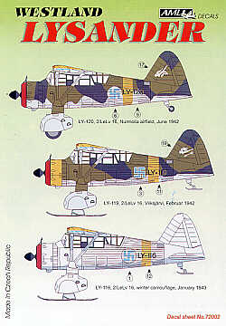 AML - 1/72 Westland Lysander (4) LY-120 2/LeLv 16, Nurmoila, June 1942, LY-119, 2/LeLv16, VIIksarvi, February 1942, LY-116, 2LeLv 16, winter camouflage, January 1943, LY-120 2/LeLv, Nurmoila, June 1942, LY-118 2/LeLv 16, August 1942, All Finnish Air Force