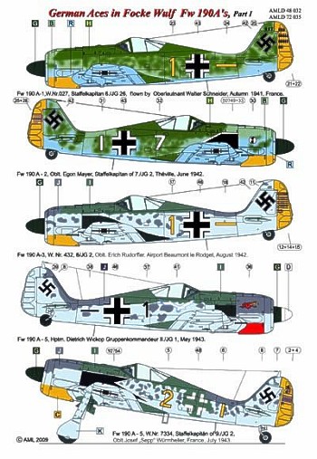 AML - 1/72 Focke-Wulf Fw-190A Luftwaffe Aces Pt 1 (5) A-1 Yellow 1 Staffelcapitan 6/JG 26 Oblt Walter Schneider France 1941; A-2 White 7 Staffelcapitan 7/JG 2 Oblt Egon Mayer 1942; A-3 Yellow 1 6/JG 2 Oblt Erich Rudorffer 1942; A-5 Black 1 Hptm Dietrich Wickop Gruppencommander II/JG 1 1943; Yellow 2 Staffelkapitan 9/JG 2 Oblt Josef Wurmheller