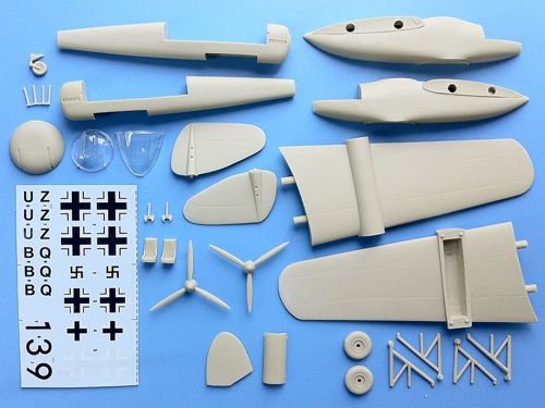 Anigrand Craftswork - 1/72 Arado Ar.E.500 Twin-boom attacker project. In 1934, the RLM issued a requirment for a destroyer airplane to several aircraft firms, who were requested to submit proposals of a heavily-armed multi-seat twin-engined aircraft the size of a medium bomber. It would possess a heavy concentration of cannon armament. Arado submitted E.500 project, incorporated an advanced armament concept. This consisted of a pair of turret-mounted 20mm cannon which could be rotated through a full 360 degree. To provide the gunners an almost unrestricted field of fire, the tail surfaces were placed on the outboard portion of the twin fins and rudders. The RLM considered the armament idea worthy of further development up to prototype stage, but following the full-scale mock-up, work on the project was stopped as it was not prepared to further Introduction of movable turrets.