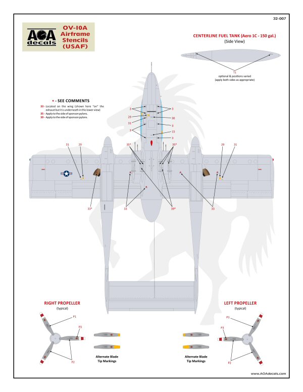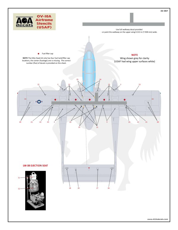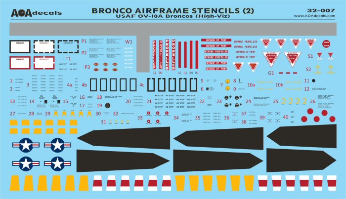 AOA Decals - 1/32 North-American/Rockwell OV-10A Broncos airframe stencils (high-viz) This sheet provides complete OV-10A Bronco airframe stencils for one aircraft in the original USAF blue-grey FAC camouflage scheme. For Kitty Hawk 1/32 OV-10A Bronco Optional one piece wing walkway decal Multiple styles of various common markings provided: Two variations of PROPELLER warnings Three variations of propeller blade tip markings . Five variations of center fuselage propellor warnings Three variations of exhaust hiding areas Three variations of the DANGER ejection seat triangles. Five variations of ARMAMENT info panel. Includes the correct number of fuel tank markings (5) - the Kitty Hawk kit represents only the four wing tanks. In addition to the standard airframe stenciling, the sheet also includes tire slip markings, centerline 150gal fuel tank NO STEP stencils, LW-3B ejection seat markings, and full sponson stenciling.