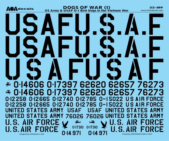 AOA Decals - 1/32 Dogs of War (1) - US Army/USAF Cessna O-1A Bird Dogs in the Vietnam War. Part one of the 1/32 Bird Dog coverage, this decal sheet includes thirteen marking options for various O-1 A/G/E Bird Dogs from the Vietnam War: