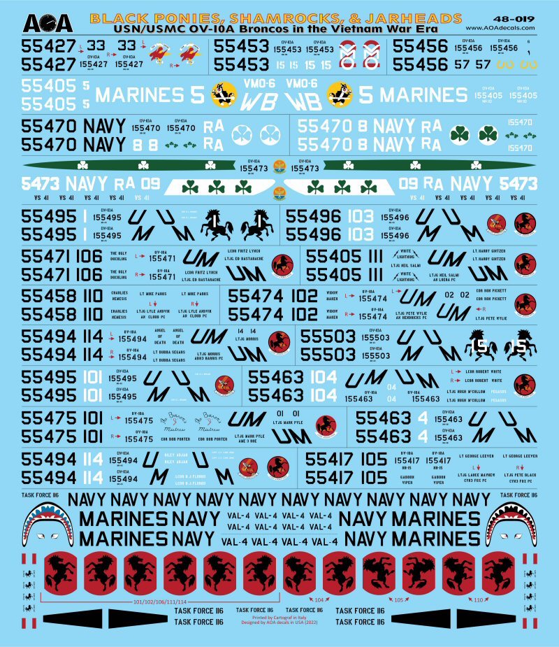 AOA Decals - 1/48 Black Ponies, Shamrocks, & Jarheads USN/USMC North-American/Rockwell OV-10 Broncos in the Vietnam War Era.This extensive 1/48 decal sheet predominately covers the Navy's unique and relatively short-lived light attack squadron VAL-4 Black Ponies, allowing the option to represent one of many possible VAL-4 Broncos throughout their entire service in Vietnam from 1969-72. Also included and related to VAL-4's history is VS-41 Shamrocks, an S-2 Tracker squadron that was responsible for the stateside training of VAL-4 crews and personnel throughout the war. Last but not least, also covered are Usmc Broncos from VMO-2 and VMO-6, both of which also used the Bronco heavily in various combat roles in Vietnam.