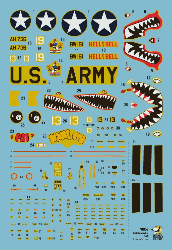Arma Hobby - 1/72 Bell P-400 Airacobra plastic/mask/3 x decal options by Techmod/steel balls for nose weight/3D-printed nose conversion has 3D conversion of nose section and colourful markings from early South Pacific Campaign in 1942