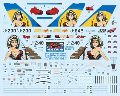 Foglio decal in scala 1/72 per il General Dynamics F-16A Block 15 del 323 Squadron "Dirty Diana" dell'aeronautica olandese.