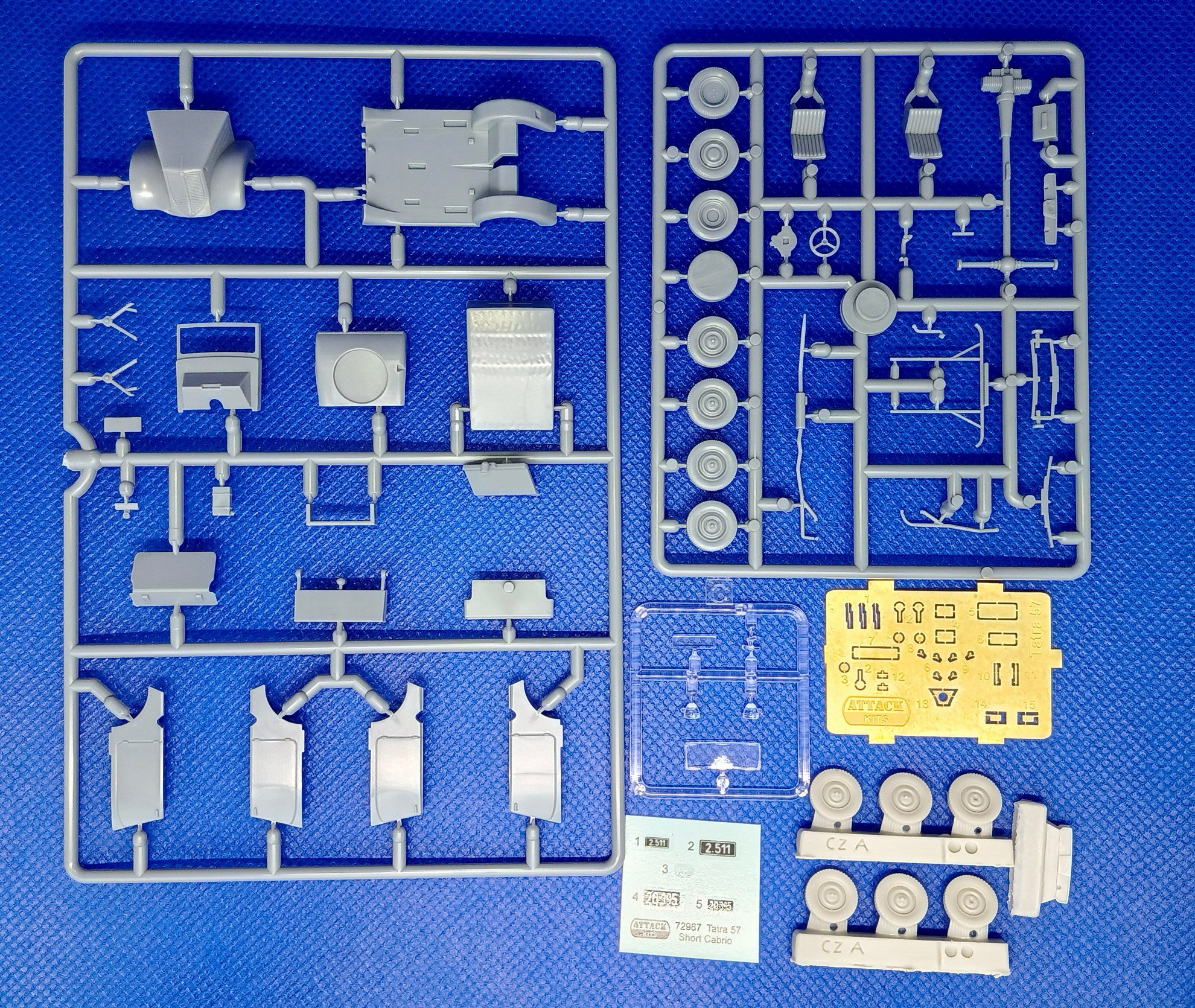 This version of the army convertible was originally designed for driver training. It differed from the standard version by a shortened rear end and an unconventional placement of the rear reserve wheel. During the war it was reportedly used by the Slovak Army on the Eastern Front. The kit contains colour schemes for both the pre-war Czechoslovak Army and the Slovak Army cars serving on the Eastern Front.