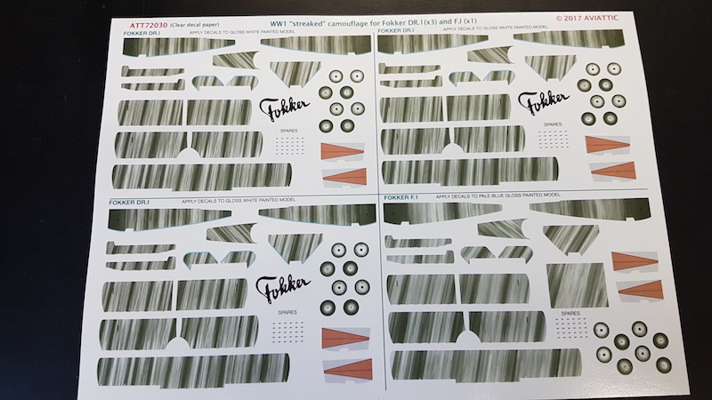Aviattic - 1/72 WWI streaked camouflage for Fokker Dr.I (x 3) and F.I (x 1). Contains three full sets with interior details for DR.I and one F.I