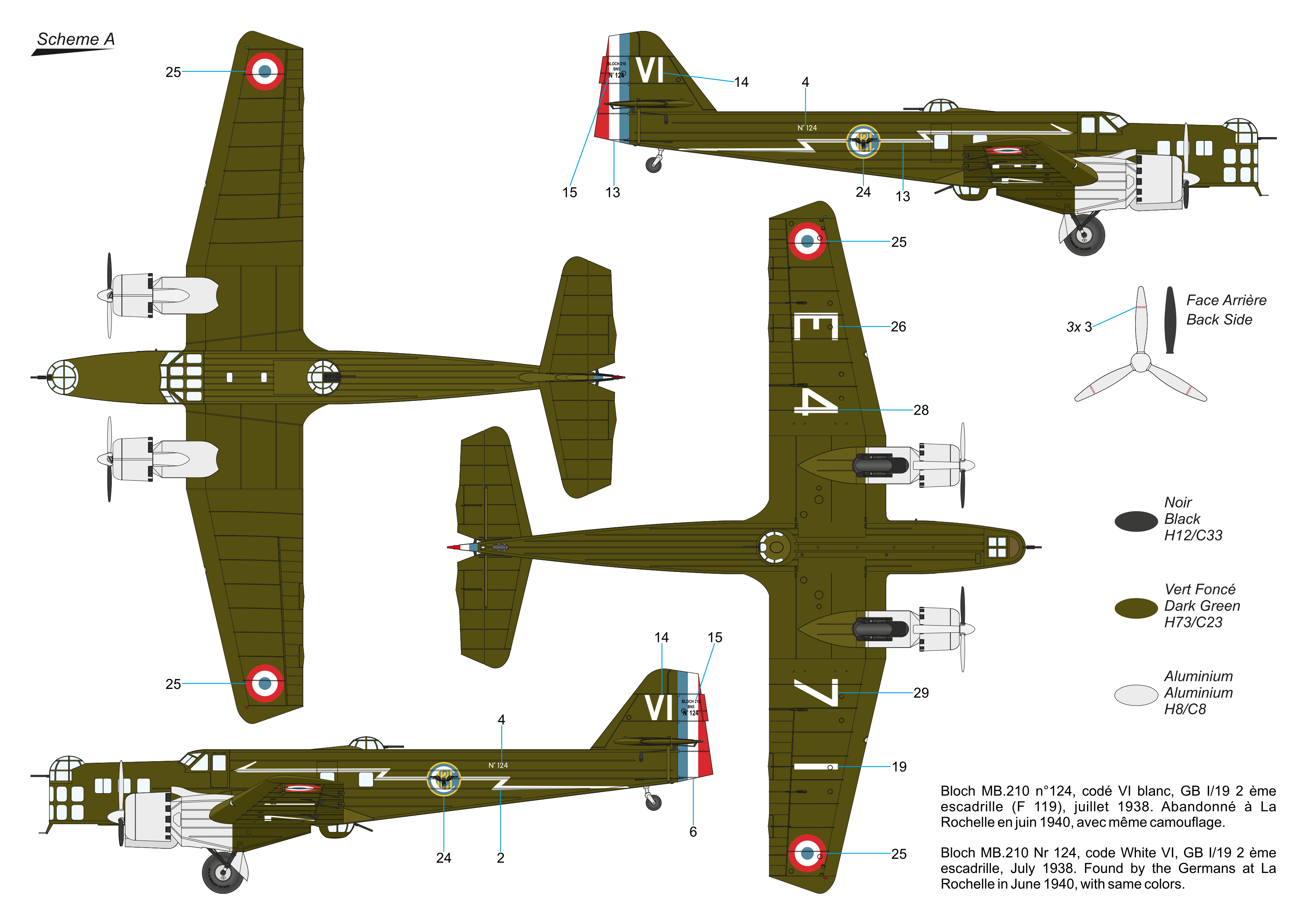 - Nr 124, code White VI, Gb I/19 2 eme escadrille F 119, july 1938. Found by the Germans at La Rochelle in june 1940, with same colors.
