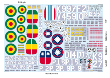 Azur - 1/72 Potez 25 Africa & Asia. Decals in 72nd for kits FR0037, FR0038, SH72407 for French Africa, Ethiopia, French Indochina, Manchuria (alternately : Japan), French Mandate in Syria, Nationalist Spain. Roundels provided only when not in the box.