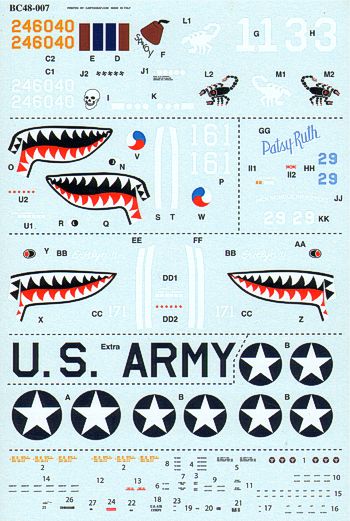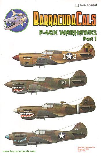 Barracuda Studios - 1/48 Curtiss P-40K Warhawks Pt 1 (4) 246040 White 13 64thFS, 57thFG Lt R.Johnson Jay Tunisia 1943, White 161 75thFS/23rdFG Maj Richardson China 1943, White 171 75th FS/23rd Fg New Guinea both with shark mouths, White 29 7th FS/49th Fg Patsy Ruth New Guinea