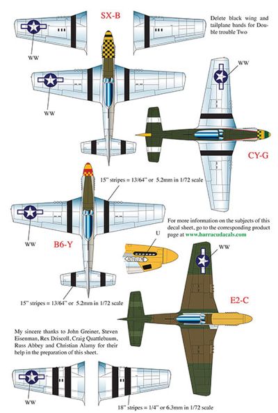 Barracuda Studios - 1/72 Scale Re=printed! North-American P-51D Mustangs of the 8th Af (5) 44-63684 SX-B 352FS 353FG Lt.Col.William B.Bailey 'Double Trouble Two' Black/Yellow check nose Raf Raydon; 44-14985 CY-G 343FS 55FG Maj. Edward Giller 'The Millie G' Yellowith Green check nose band Raf Wormingford; 44-14888 B6-Y 363FS 357FG Chuck Jaeger 'Amourous Len III' 1944 Red/Yellow check nose band Raf Yoxford; 44-13410 E2-C 375FS Lt.Col Thomas Christian Kia 12-8-44 'Lou IV/Athelene' Yellow Nose Raf Bottisham; 44-15092 SX-B 'Alabama Rammer Jammer' Black/yellow nose band Raf Raydon.