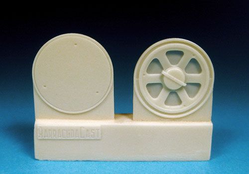 Barracuda Studios - 1/32 Republic P-47C/P-47D Thunderbolt Block Tread Mainwheels . This set contains a pair of detailed resin main wheels with crisply molded, seamless and accurate block tread pattern. You can choose between plain, covered or 6 slot hubs. The inner wheel hub detail is visible through the slots of the outer wheel hub, bringing a whole new level of detail. Makes a quick, easy and very visible upgrade (designed to be used with Hasegawa, Trumpeter (whose wheels are just plain wrong) and Revell kits)