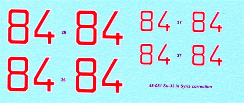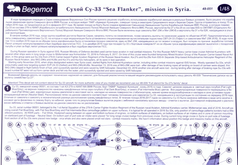 Begemot - 1/48 Sukhoi Su-33 from Soviet Naval Aviation in Syria. 10 markings scheme any Su-33s aircraft, which took a part in Admiral Kuznetsov carrier mission in Syria. Decal includes insignias, board numbers, badges and mission marks. This set Does Not include stencil for aircraft and external armament, please use BT4809 Su-27 family full stencil. Including one big size decals and two-pages instruction.