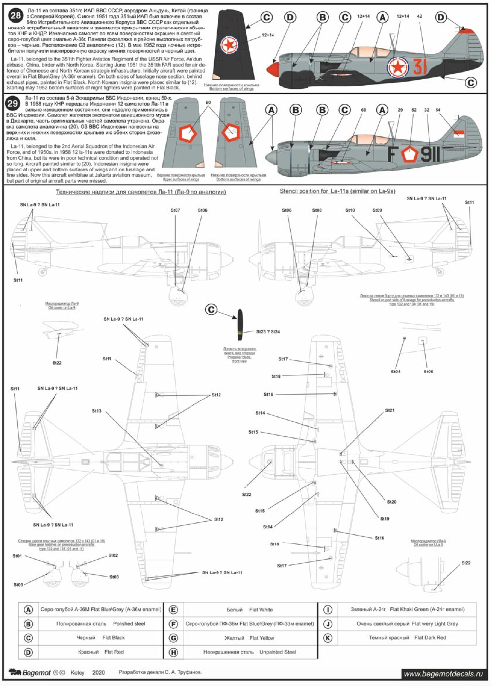 Begemot - 1/48 Lavochkin La-9/La-011 Decal with opportunity make 29 marking variations of La-9 and La-11 family aircraft's all types, from next AF's: USSR, China, North Korea, Romania and Indonesia. 4 sets of full stencil for La-9(11) aircraft included.