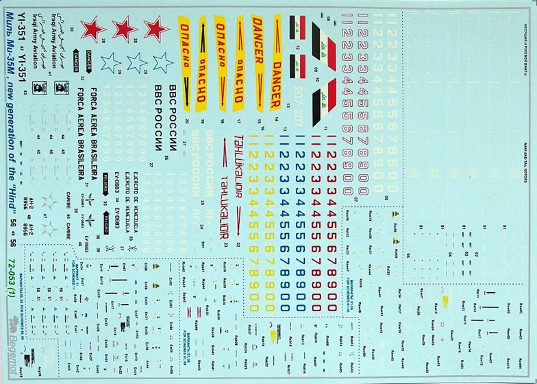 Begemot - 1/72 Mil Mi-35M Hind. Decal designed for 11 marking schemes of new generation Hind helicopters in Russian, Brazil, Venezuela, Iraq and Azerbaijan Af and include 5 different stencil sets.