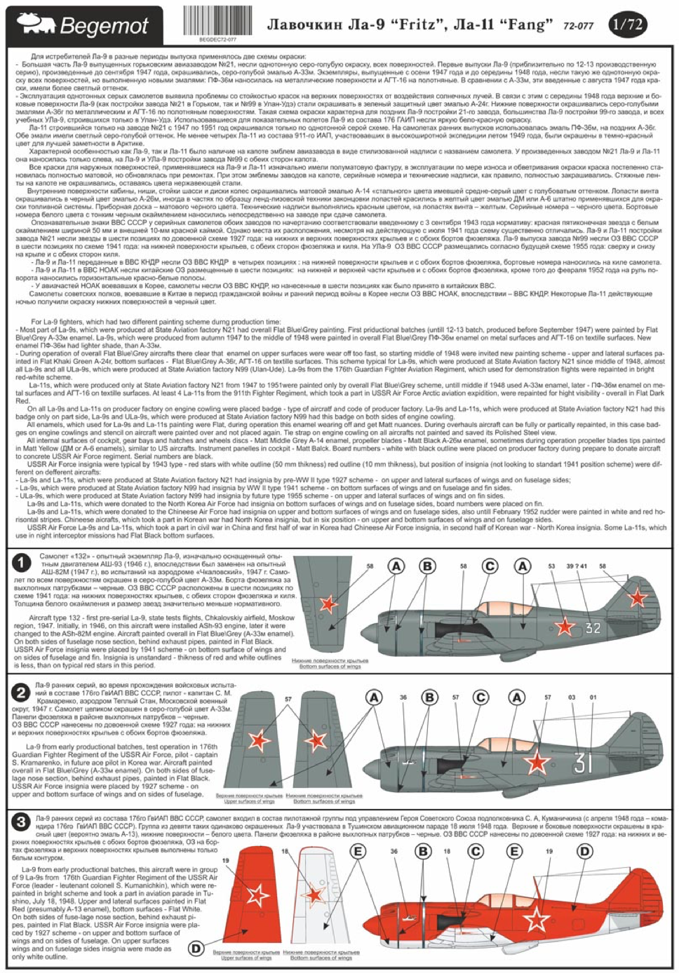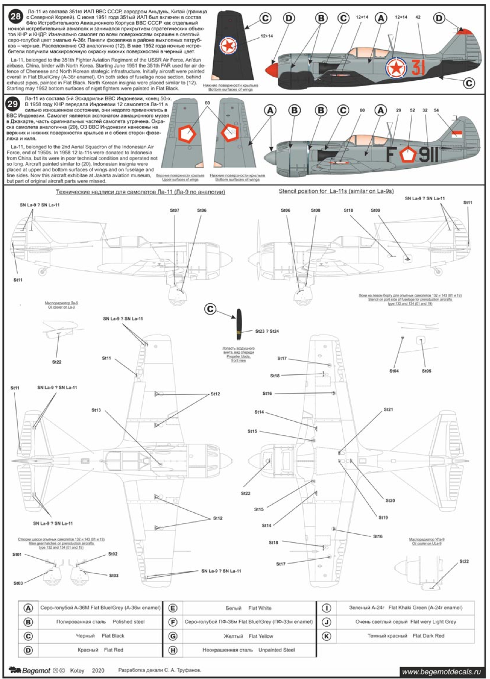 Begemot - 1/72 Lavochkin La-9/La-11 Decal with opportunity make 29 marking variations of La-9 and La-11 family aircraft's all types, from next AF's: USSR, China, North Korea, Romania and Indonesia. 4 sets of full stencil for La-9(11) aircfat included.