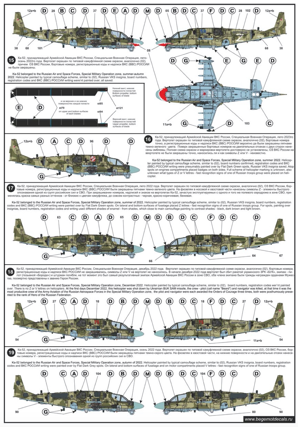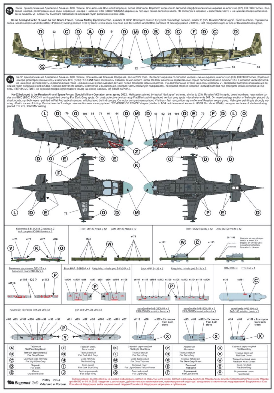 Begemot - 1/144 Kamov Ka-52 Alligator Decal with opportunity make 26 marking variations of Ka-52 Alligator family helicopter all types, from Russian Army Aviation. Including one small size decal and 6-pages instruction A3-size instruction.