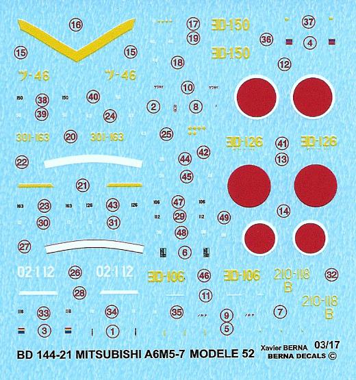 Berna Decals - 1/144 Mitsubishi ZERO A6M5-7 Model 52-63: Oita (J-46) 1945, Morioka (ED-106) 1945, 201 Kokutai (02-112) 25/10/1944, Akamatsu 1945, Suzuki (301-163) 1944, 302 Kokutai 1945, 210 Kokutai 1945