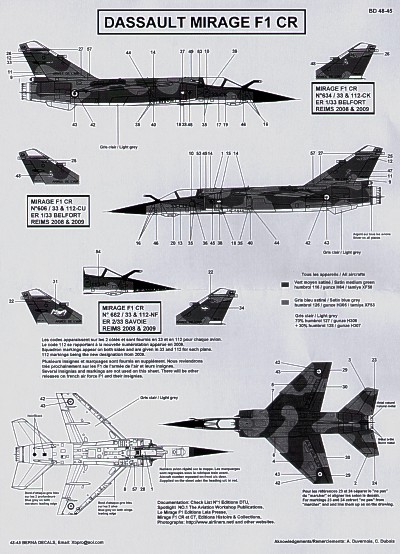Berna Decals - 1/48 Dassault Mirage F.1CR (3) No 634/33-CK or 112-CK ER1/33 Belfort; No 606/33CU or 112-CU ER1/33 Belfort; No662/33-NF or 112-NF ER2/33 Savone. All Reims 2008/9. Data etc. for one aircraft.
